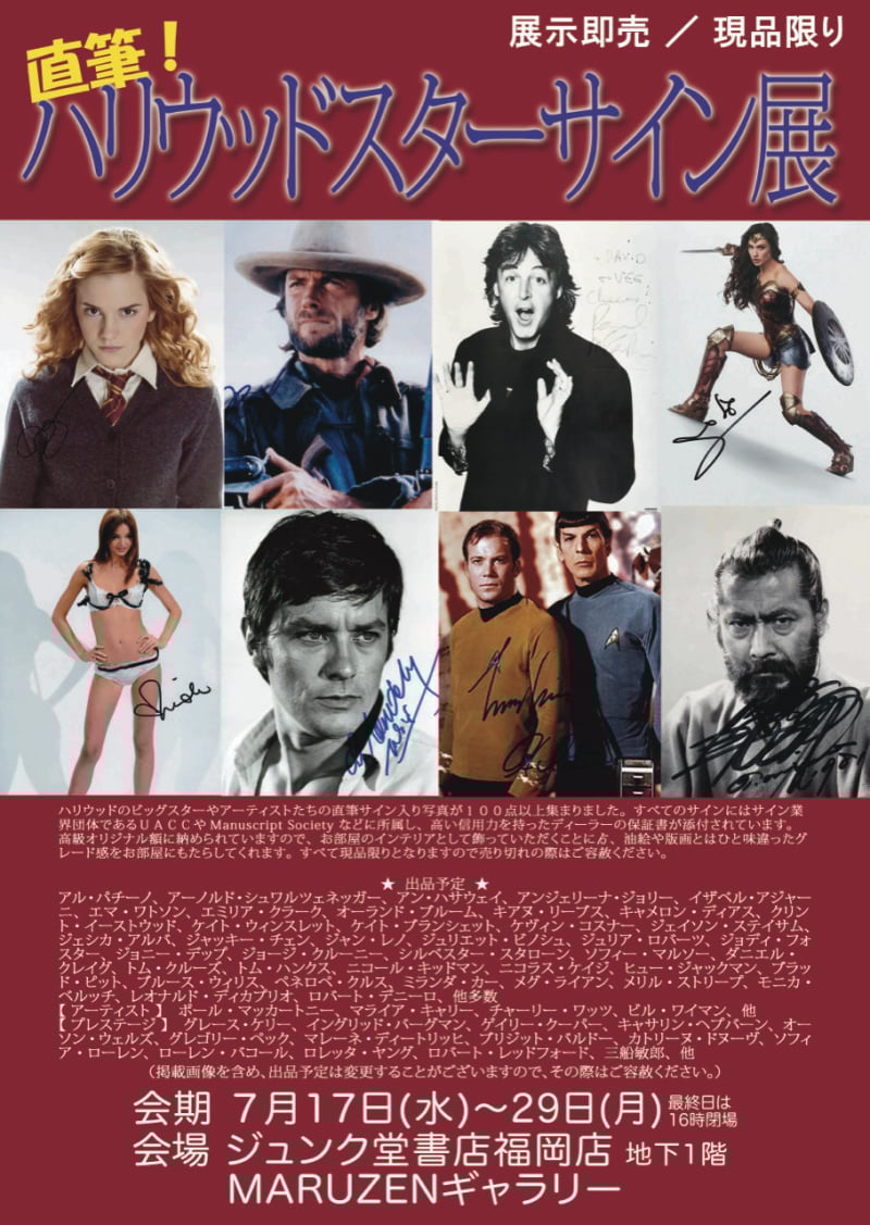 ハリウッドのスター・アーティストの直筆サイン入り写真が100点以上を展示即売いたします。