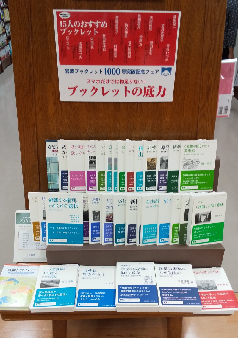 店頭では、フェア書目を含む、15人の方のおすすめブックレットを紹介したエッセイや創刊以来1000号までの歩み、在庫目録まで入った小冊子「岩波ブックレット1000号突破記念フェア 15人のおすすめブックレット」を配布しております(なくなり次第終了)