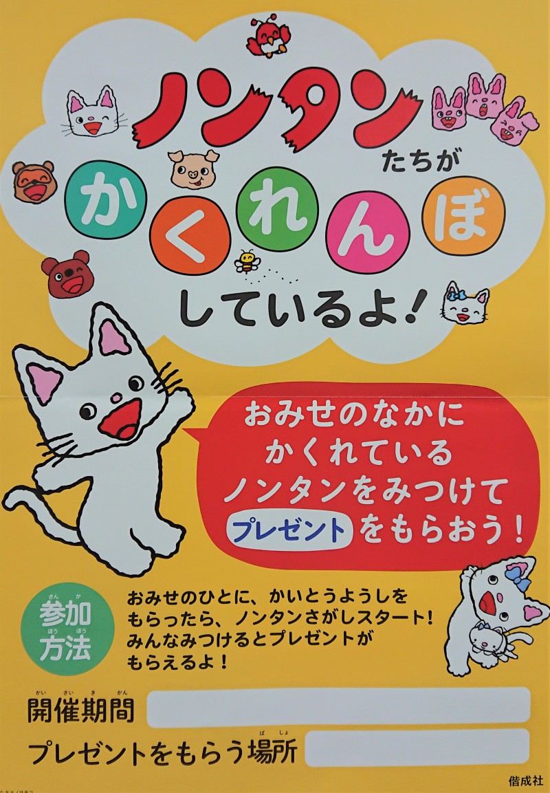 お店のなかにかくれている、ノンタンとなかまたちをみつけよう!みんなをみつけたら、プレゼントがもらえるよ!お子様でしたらどなたでも無料でご参加いただけますので、サービスカウンターでイベントキットを貰ってね!(プレゼントが無くなり次第終了させていただきます)