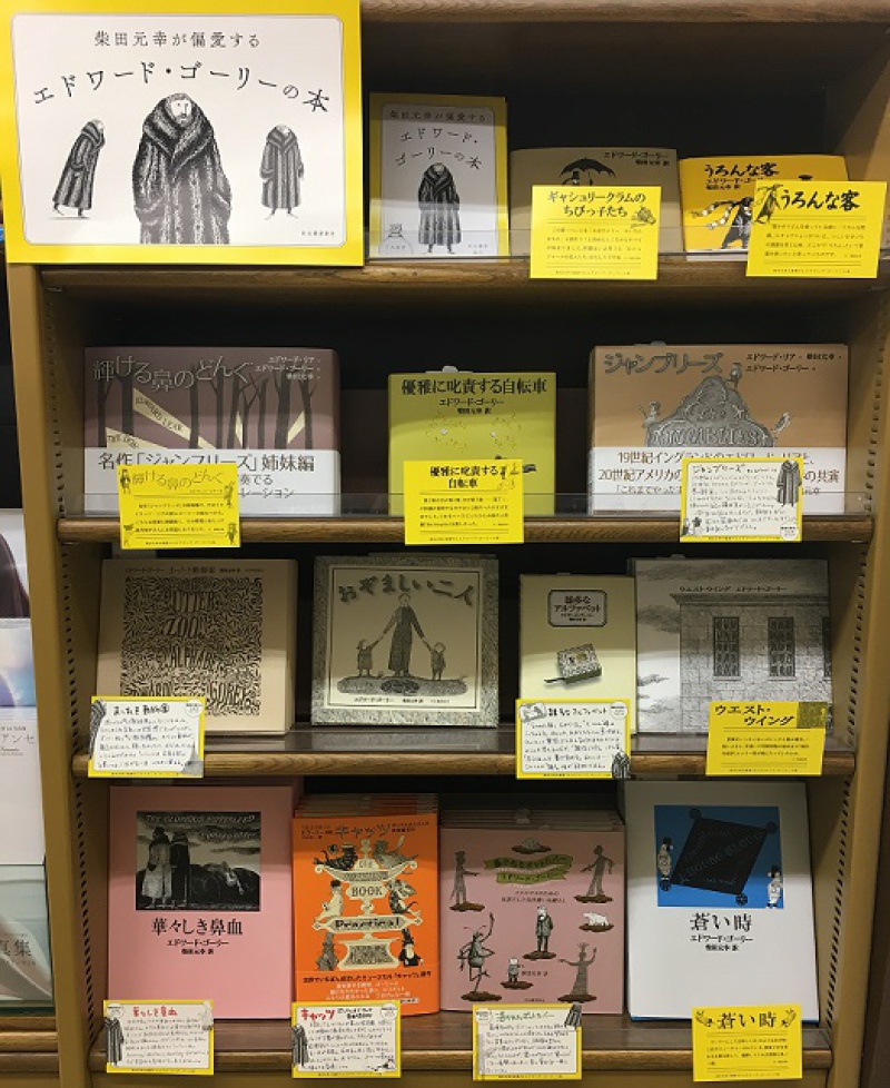 残酷で美しい、エドワード・ゴーリーの世界へようこそ。今回は翻訳している柴田元幸さんのおすすめPOP&フリーペーパーも併せて展開していますので要必見です★10月には新刊も発売予定。このナンセンスな独特の世界観にはまってしまうと全て揃えたくなってしまうので要注意!ハロウィンにもおすすめです。1F文芸書1番にて。