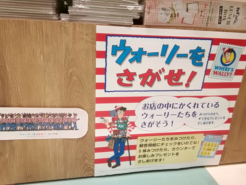 4F児童書売り場の中にウォーリーとその仲間たちが隠れています。その中の5人を探し出して、専用用紙にチェックを入れてカウンターへお持ちください。景品さしあげます。ちょっと難し目かなー、と思われるので一つ見つけて頂くと、そこにヒントをご用意してますのでがんばって探してみてくださいね!コンプリートできるとちょっとだけ達成感あるかもです。
