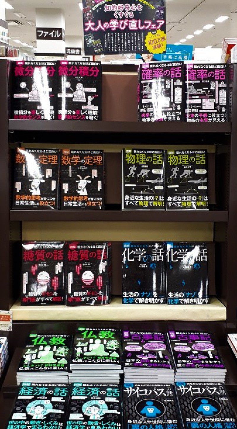 日本文芸社の「眠れなくなるほど面白い図解シリーズ大人の学び直しフェア」をレジ前フェアコーナーにて開催中です。学校で習った数学や物理をこのシリーズを読んでもう一度学び直しませんか?苦手だった教科や忘れていたことも楽しく学び直せるはずです。読んだら誰かに教えたくなります!ぜひご覧くださいませ。