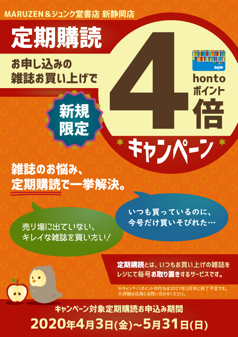 新規限定・定期購読hontoポイント4倍キャンペーン(新静岡店限定)