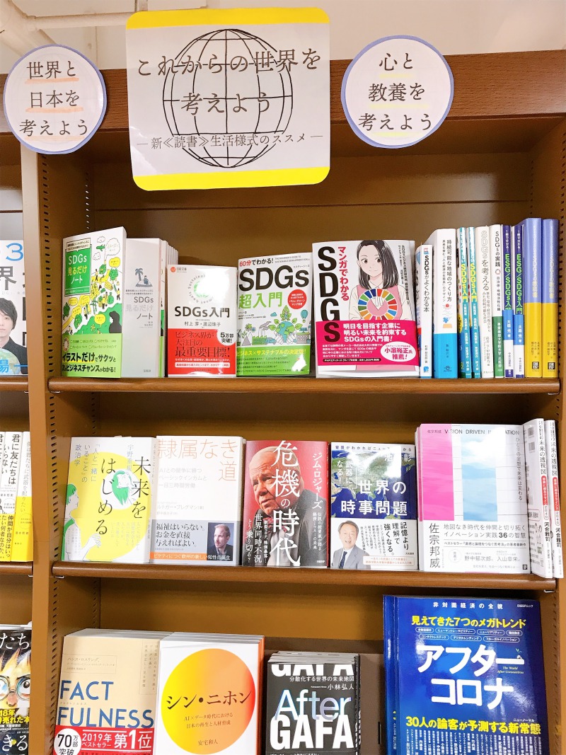 新・読書生活様式のススメとして「心と教養」「世界と日本」「環境を考える」をテーマにおすすめの本をご用意しました。アフターコロナの未来予測に関するものや、今話題のSDGsについてなど、知っておきたい情報満載です。下りエスカレーター近く、社会1棚の裏側にございますフェアコーナーまでぜひお越しください。