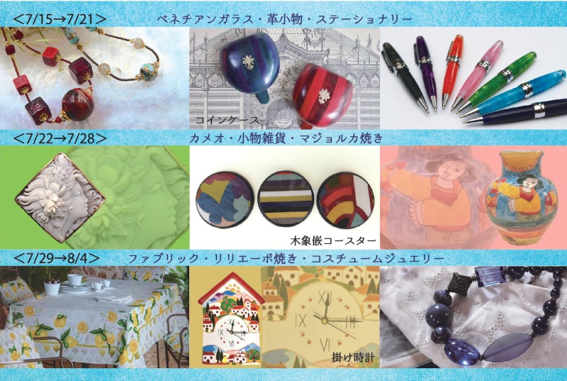 イタリアからカラフルなアクセサリーや雑貨が勢揃い。週替りで色々なお店が登場します。お好みのアイテムを探してみてはいかがでしょう?是非お立ち寄りください。