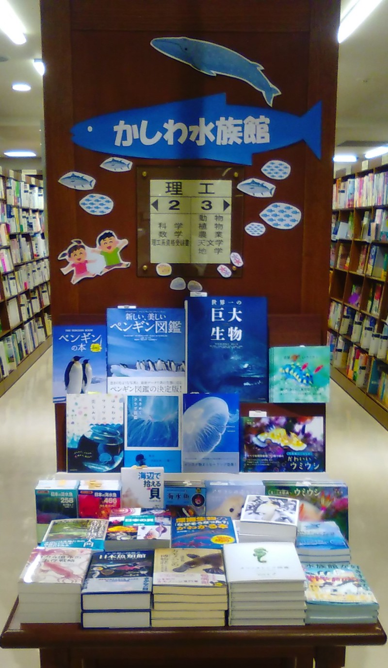 昨年大好評だった『かしわ動物園』『かしわ水族館』が今年も開園しまた。動物や魚、海や水辺の生きものの書籍をたくさん展開しています。ぜひご来園?ください。画像は『かしわ水族館』です。(注)実際に動物やお魚がいるわけではなく夏の理工書フェアのご案内です。