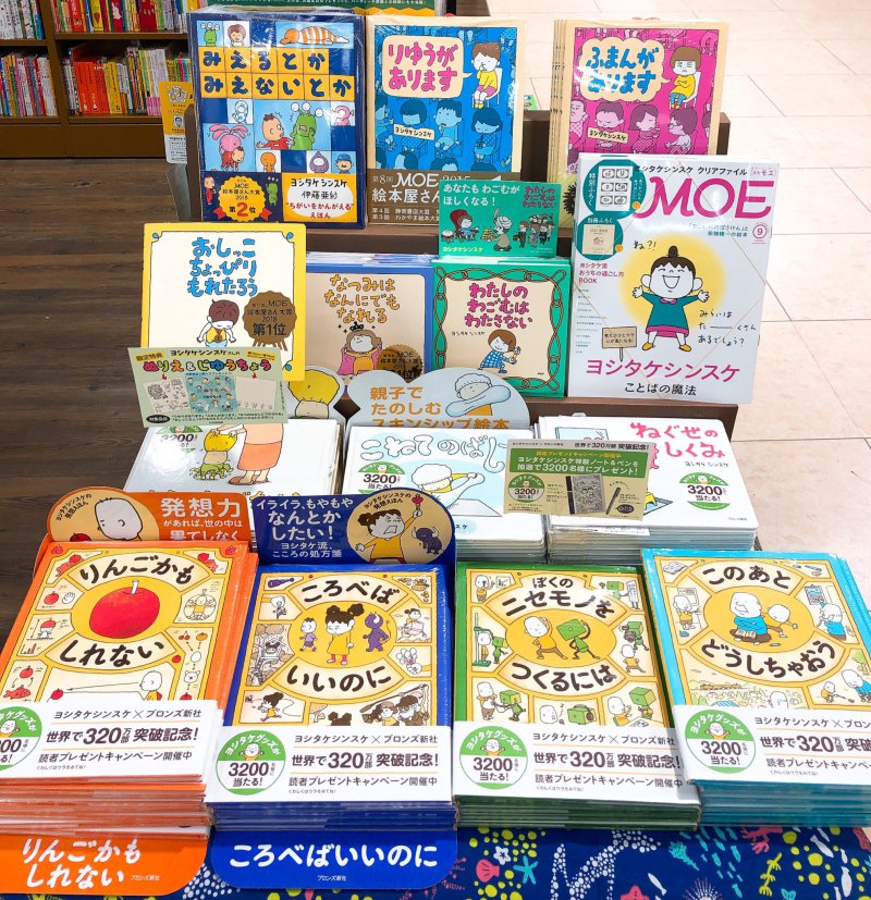こどもにも大人にも大人気の、ヨシタケシンスケさんの絵本を集めたフェアを展開中です。ブロンズ新社より発売された絵本最新刊「ねぐせのしくみ」はもちろん、ヨシタケさんのオリジナルクリアファイルと「STAY HOME」をテーマにした絵本の付録つきで、ヨシタケさんがつくり出す「ことば」の魅力に注目した特集の組まれた雑誌「MOE9月号」もあわせて展開中しています。ぜひ手に取ってごらんください。