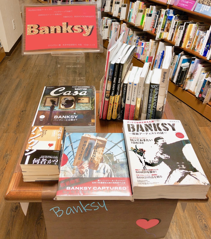 世界各地でゲリラ的に出没し、話題を呼ぶストリート・アーティスト、バンクシー。大阪でも10月から「バンクシー展 天才か反逆者か」が開催される予定となっていますね。芸術書売り場では、そんなバンクシーに注目したミニコーナーが出来ました。活動やメッセージ、作品の背景を紐解く1冊や、謎に包まれたバンクシーの姿が写された作品集などを集めています。ぜひ手にとってみてください!