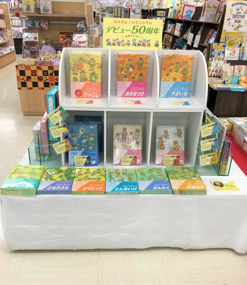 絵本作家いわむらかずおさんのデビュー50周年を記念して、童心社の「14ひきの」シリーズのフェア開催中です。春夏秋冬の自然を絵本の中で楽しめるシリーズです。あまり外へ出られない今、大人になった皆さまも童心に帰って、絵本の中で自然を味わってみませんか?児童書売場にて開催中です。