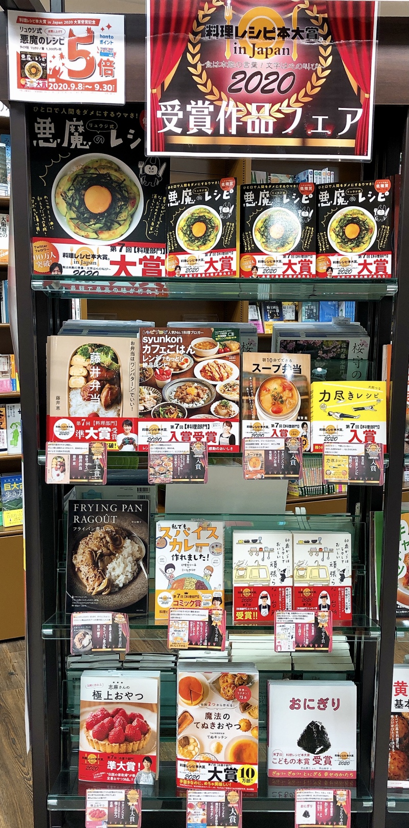 今年で第7回をむかえた料理レシピ本大賞。今回料理部門の大賞を受賞したのは「リュウジ式 悪魔のレシピ(ライツ社)」です。受賞を記念して、9月30日(水)までの期間限定で「悪魔のレシピ」お買上げ時の「hontoポイントが5倍」になるキャンペーンを開催中です。この機会にぜひお買い求めください。話題書コーナーでは、大賞受賞作はもちろん各賞受賞作を集めてフェア展開していますので、ご来店の際はチェックしてみてくださいね。
