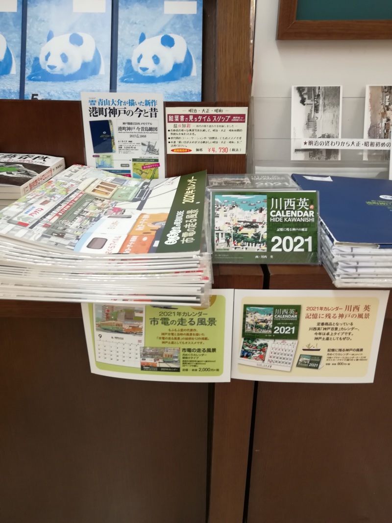 今年も毎年ご好評いただいています川西英さんの神戸カレンダーが入荷いたしました。今年は去年よりコンパクトになり、イラストも長田神社から高架下の風景まで、神戸の様々な表情を見事に切り取っています。今年はもう一点、「もふもふ堂の昭和KOBE 市電の走る風景」を販売しています。こちらは昭和の三宮や新開地を走る市電の風景を描いた作品です。2021年が終わった後も部屋に飾っておきたい一品です。どちらもレジ前の神戸関連コーナーにございますので、ご来店の際は是非一度ご覧下さい。