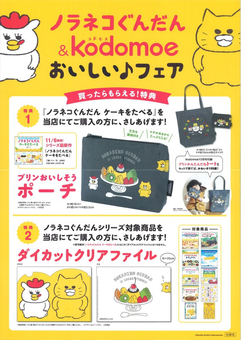 『ケーキをたべる』ご購入頂いた方に、特典として「プリンおいしそうポーチ」を、既刊のシリーズをお買い上げの方には、「ダイカットクリアファイル」をお渡しいたします。同日発売の『kodomoe 12月号』の付録には、「プリンかんたんだねトート」が登場です!