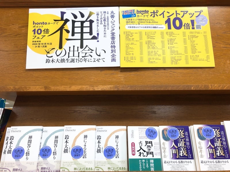 仏教書目録刊行会主催「禅との出会い」フェア開催中です。今年の鈴木大拙生誕150周年によせて、大拙の説いた「無心ということ」、禅の精神を訪ねる禅と仏教の入門書を集めました。新型コロナウイルスにより私たちの社会や生き方は大きく揺さぶられています。“With コロナの時代”を生きぬく道を探るための一冊をぜひ見つけて下さい。『仏教書総目録』『仏教のすすめ』2021年最新版も無料で配布しております。レジ前フェア棚にて。
