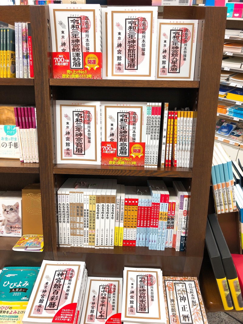 日本の伝統文化である「こよみ」入口フェア台裏側にて展開中です。新たな年の指針として、日々の暮らしや季節に思いをめぐらす一冊として。暦の説明、九星別各人の運気の動向や、納音・十干・家相学・姓名学・命名字典など、また行事欄には、干支・九星・行事・六輝・中段・二十八宿・下段、日の出入・月の出入・満干潮時など詳細に記述されています。