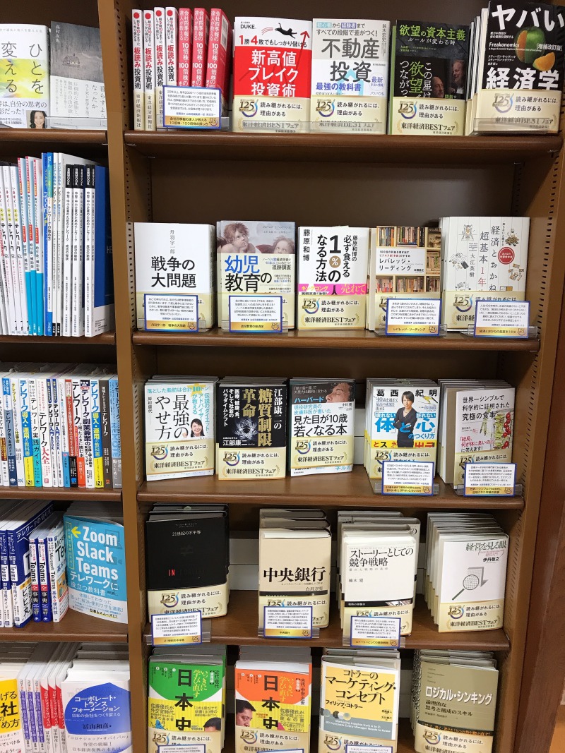 雑誌「週刊東洋経済」でおなじみのビジネス書の老舗出版社、東洋経済新報社が125周年を迎えました。これを記念し「読み継がれるには理由がある」をテーマにフェアを開催中です。かつて石橋湛山が在籍していたことでも有名で、ビジネスに役立つ本や、経済・投資の本を幅広く出版しています。ぜひこの機会にお手にとってご覧ください。