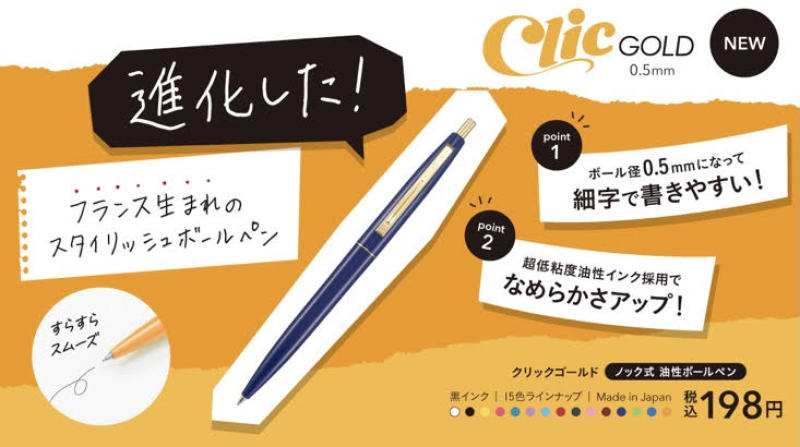 従来のクリックゴールドに比べ、字幅は手帳に書き込みやすく、インクは超低粘度油性インクで書き味なめらかに、ボディは親しみのあるABS樹脂素材に、生産国は安心安全の国内生産となっております。