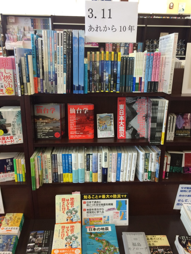 東日本大震災から10年。震災直後に発売された現地の様子を伝える本や、その後発売された関連本の一部を集めたコーナーを設置しております。この10年間、各地で地震、台風、豪雨など様々な大きな災害が起こり、そして現在、終わりの見えないコロナ禍の中で我々は暮らしています。当時を振り返り、今後いつ起こるか分からない大きな災害、経験したことのない事態へ備える気持ちを新たにしたいものです。