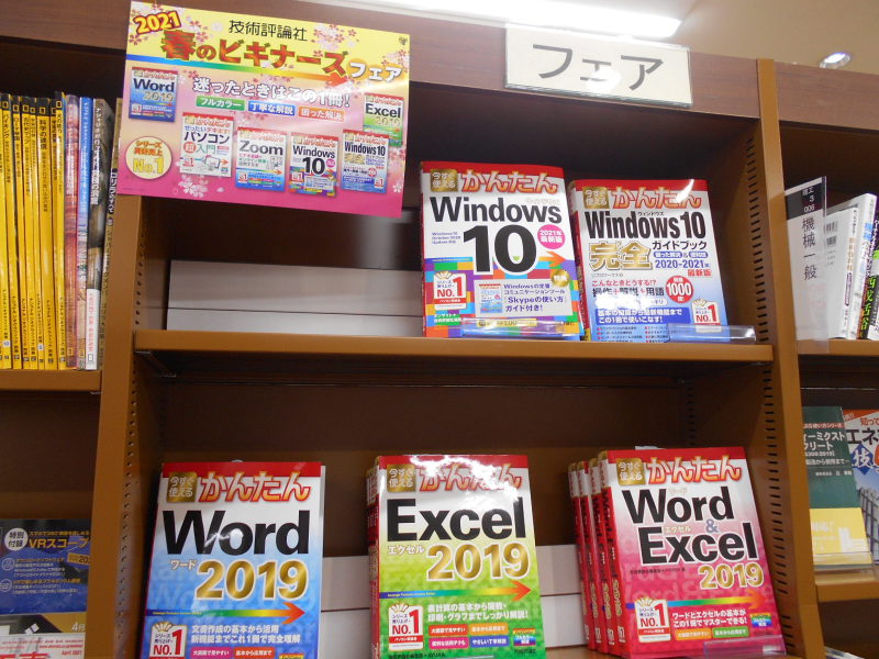 便利な機能が色々あるはずなのに、いまいち使いこなせていない気がする。パソコンをつかっていて、そう感じることはありませんか?それを解決するために簡単に理解できる本を買おうと手に取ってみたものの、開いた瞬間細かい字がびっしりで自分が知りたい情報が何処にあるのかなかなかわからず、大変な思いをしたことはありませんか?そんなあなたにお勧めの、2021春のビギナーズフェア!今すぐ使えるかんたんな本が勢揃いしています。PCコーナーへ、是非お立ち寄りくださいませ。