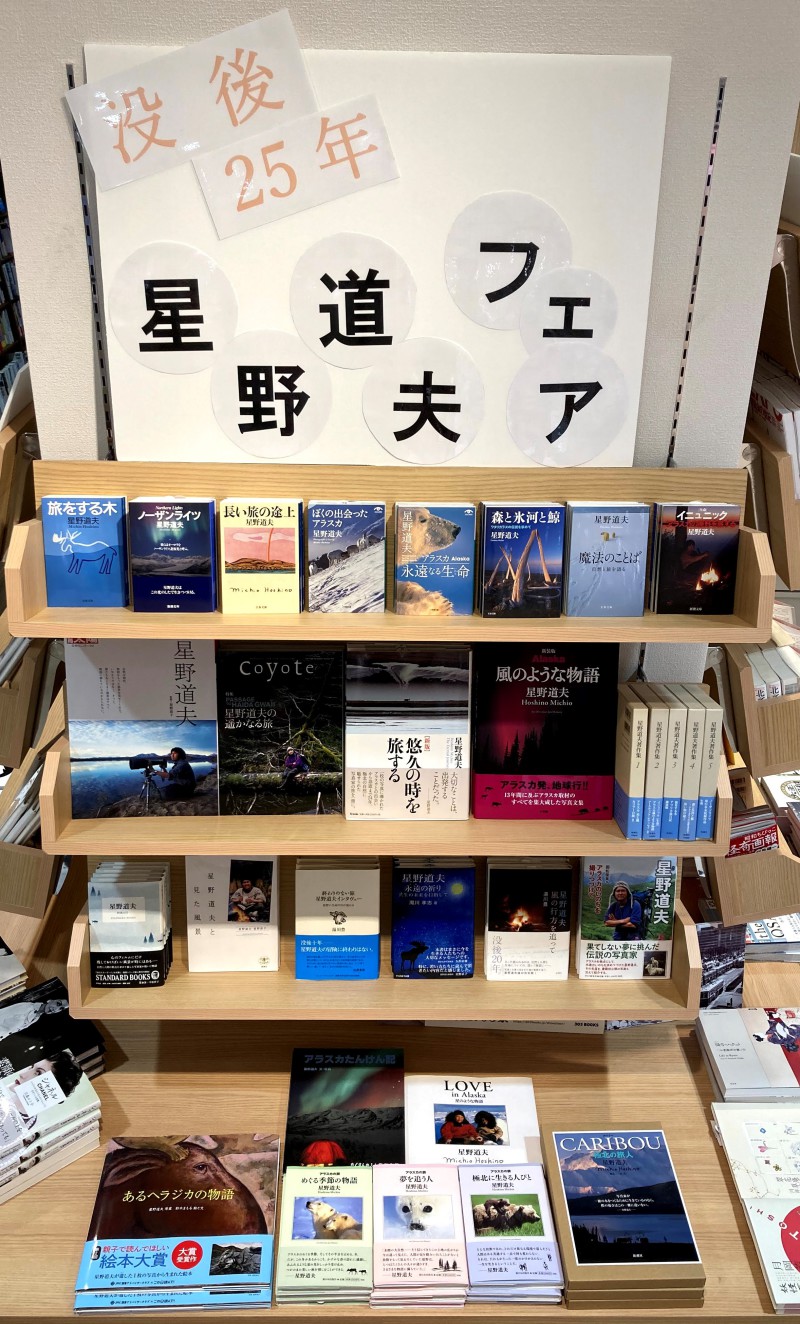 芸術書売り場にて星野道夫さんの写真集や絵本などの著作を集めたフェアを開催しております。星野道夫さんはアラスカの地で最後まで写真を撮り続け、1996年撮影中にヒグマに襲撃され命を落とされました。今年2021年は星野道夫さんの亡くなられた1996年から25年がたちます。生涯を通してアラスカ後で過ごし数々の素晴らしい写真や言葉を日本にすむ私達に届けてくれました。星野道夫さんの言葉を通してみる自然の風景は私達を束の間悠久の時へと誘ってくれます。フェアは4月30日まで開催しておりますのでご来店の際はぜひ御覧ください。