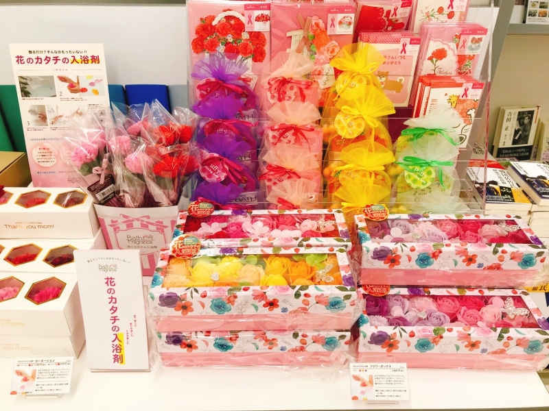 今年の母の日は5月9日(日)、母の日ギフトフェア開催中です。花のカタチの入浴剤「フラワーボックス」「カーネーション」は、まるで生花のようなバスフレグランス。お風呂で花びらを浮かべて、フローラルソープの香りを楽しめます。「消臭アーティフィシャルフラワー」は、置いておくだけで空気の清浄化を促進する、触媒加工済です。「ミニョンブーケ」は、アーティフィシャルフラワーと愛らしいマスコットがセットになっています。ギフトカードも販売中。無料でラッピングいたします。