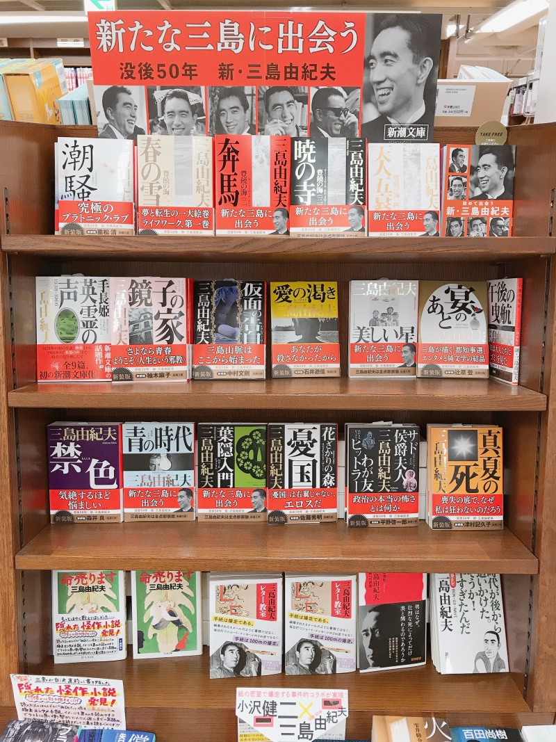 昨年の11月で三島由紀夫が世を去ってちょうど50年でした。それに合わせまして『新たな三島に出会う』新・三島由紀夫フェアを昨年11月より開催中です。2020年は「三島由紀夫vs東大全共闘 50年目の真実」というドキュメンタリー映画が全国で上映され、今年5月からはEテレ「100分de名著」で三島由紀夫の「金閣寺」を取り上げます。彼の作品への再評価がすすむ中、もう一度読みたいと考える読者が増えています。文庫・新書フェアコーナーにぜひお越しくださいませ。