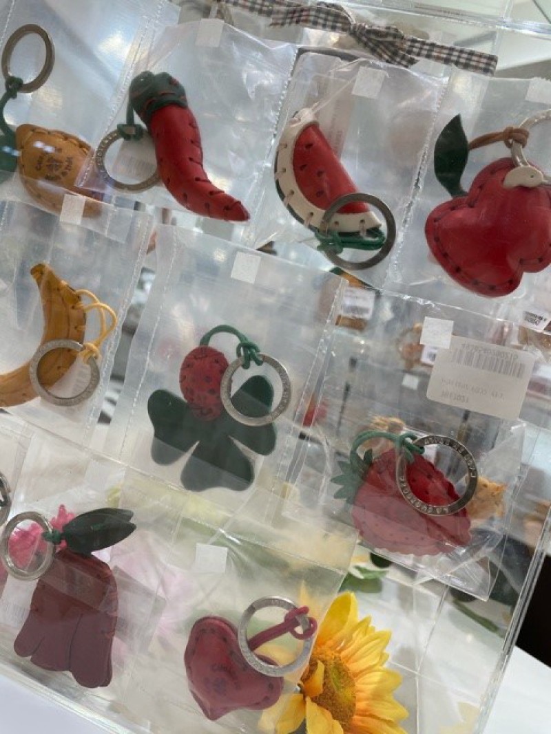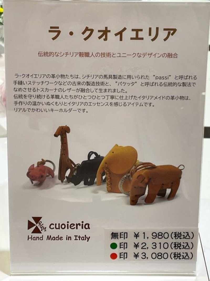 イタリア「ラ・クオイエリア」の本革で作られたキーホルダーを展示しております。ひとつひとつが手作りの革小物は、動物・花など多種にわたりデザインの展開がございます。手のひらサイズのデザインです。個性的でさりげなく持てる革小物、ちょっとしたプレゼントにいかがでしょうか?