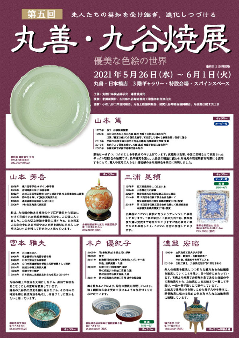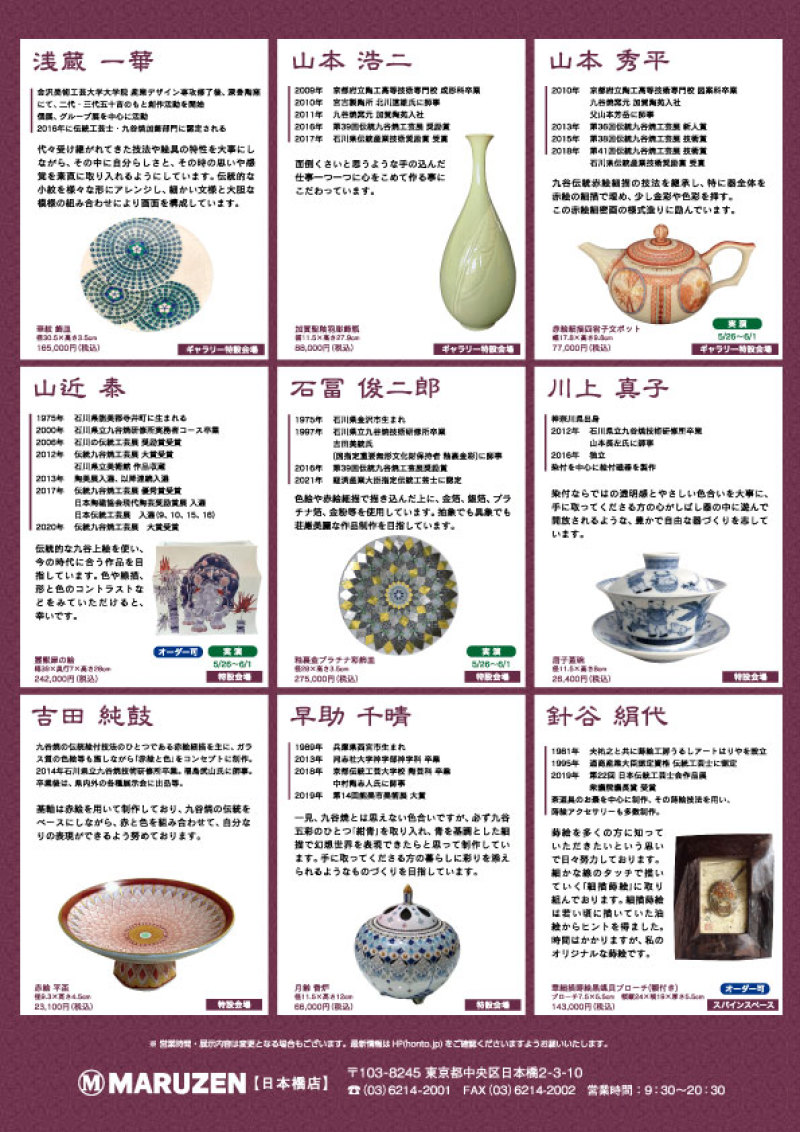 【出品予定作家】山本篤、山本芳岳、三浦晃禎、宮本雅夫、木戸優紀子、浅蔵宏昭、浅蔵一華、山本浩二、山本秀平、山近 泰、石冨俊二郎、川上真子、吉田純鼓、早助千晴山中塗・針谷絹代