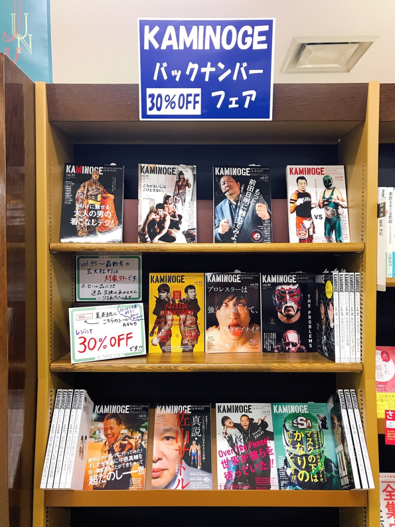 大人気プロレス誌「KAMINOGE」バックナンバーフェア開催中!vol.94以前のバックナンバーを【30%OFF】で販売しています!気になっていたあの号があるかも?表紙を見ているだけで思い出がよみがえるようです…。実用書㉘にて熱く展開中!無くなり次第終了のため、お早めに!※玄文社刊のvol.95~最新号は定価での販売です。ご了承下さいませ。