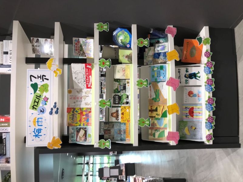 丸善有明ガーデン店では、カエルと鳥獣戯画、そして、雨の日にしか使えない、傘や長くつをテーマにした本をそろえております。