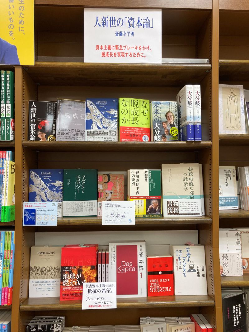ベストセラー、斎藤幸平著『人新世の「資本論」』を読み解くフェアです。「資本主義に緊急ブレーキをかけ、脱成長を実現するために」斎藤氏の著作を中心に様々な視点で選書しています。マルクス、資本論、資本主義、環境破壊について書かれた書籍から、「脱成長コミュニズム」を実現するための手掛かりになりそうな書籍を集めています。