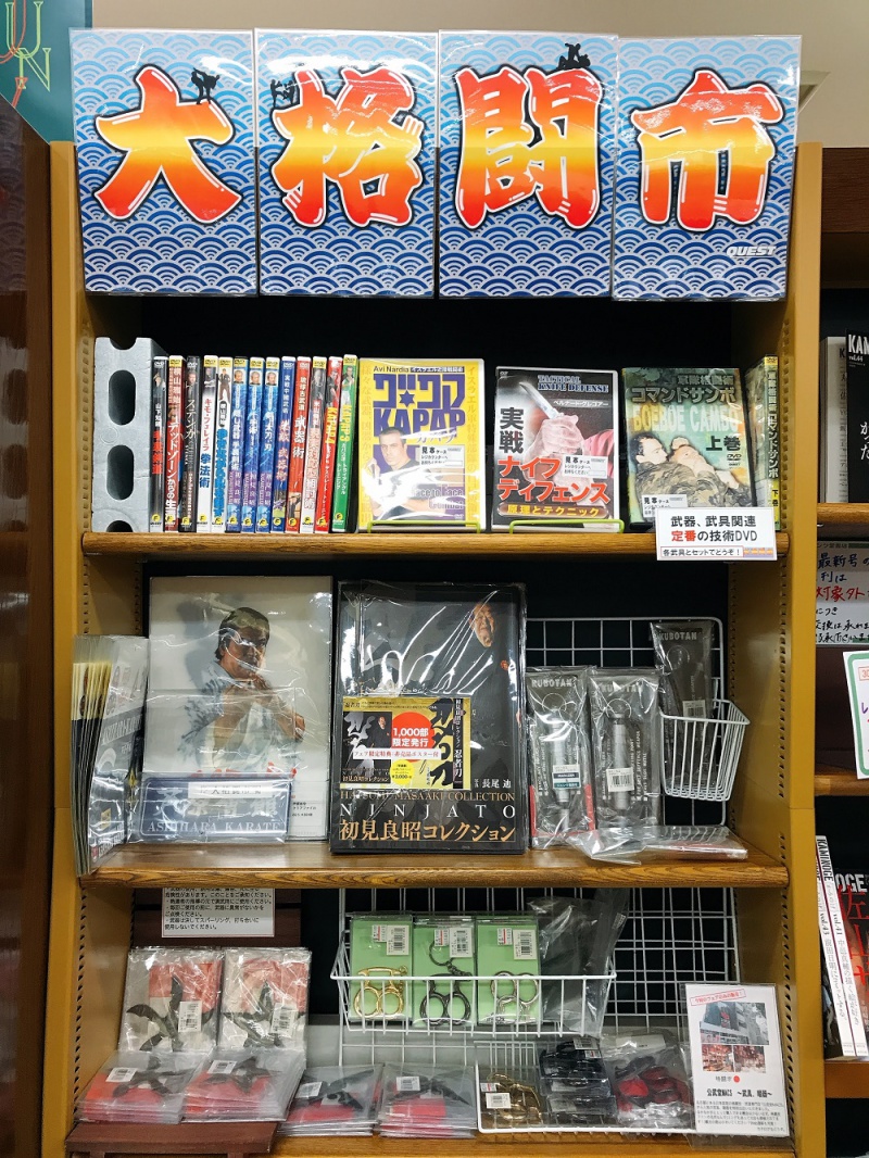 当店では初実施となる『大格闘市』始まりました!ここは書店だよな?と思われてしまいそうなフェアですが…当店のお客様にはお好きな方たくさんいらっしゃると思うのでぜひ一度見に来て頂きたいフェアです!手裏剣やナックル、クナイ、ラバーヌンチャクなど好きな人にはたまらない『武具』置いてます。殺傷能力のない、練習用や観賞用の商品です。併せて武器・武具関連のDVDもございますのでご一緒にどうぞ。1F実用書28番棚にて展開中です。