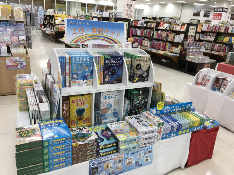 夏休みの宿題はこれで大丈夫!自由研究、工作のフェアのご案内です。自由研究や自由工作を楽しく取り組める本やキットがたくさんあります。何をしようか悩んだら、児童書売場のコーナーをぜひご覧ください!星の観察や身近な虫の観察、せっけん作りなど、おうち遊びでも楽しめます。