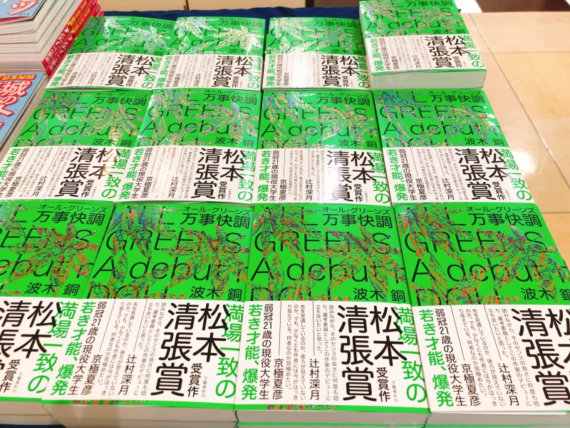 【茨城出身!「波木銅」さん】第28回松本清張賞受賞作品『万事快調〈オール・グリーンズ〉』大量入荷!店頭入口にて大展開中です。"私が書きたかったのは、不公平なゲームに抗うための手段としての友情や連帯、そして怒りとユーモア(「オール讀物」2021年6月号より)" 。東海村のラップグループ「東海村サイファー」に所属し「ニューロマンサー」と呼ばれる女子高生が、水戸のDJトラックメーカー佐藤幸一、通称「ノスフェラトゥ」の家から盗んだ“植物”を栽培し売りさばこうとする...ここからおさらばするには金!とにかく金がいる!