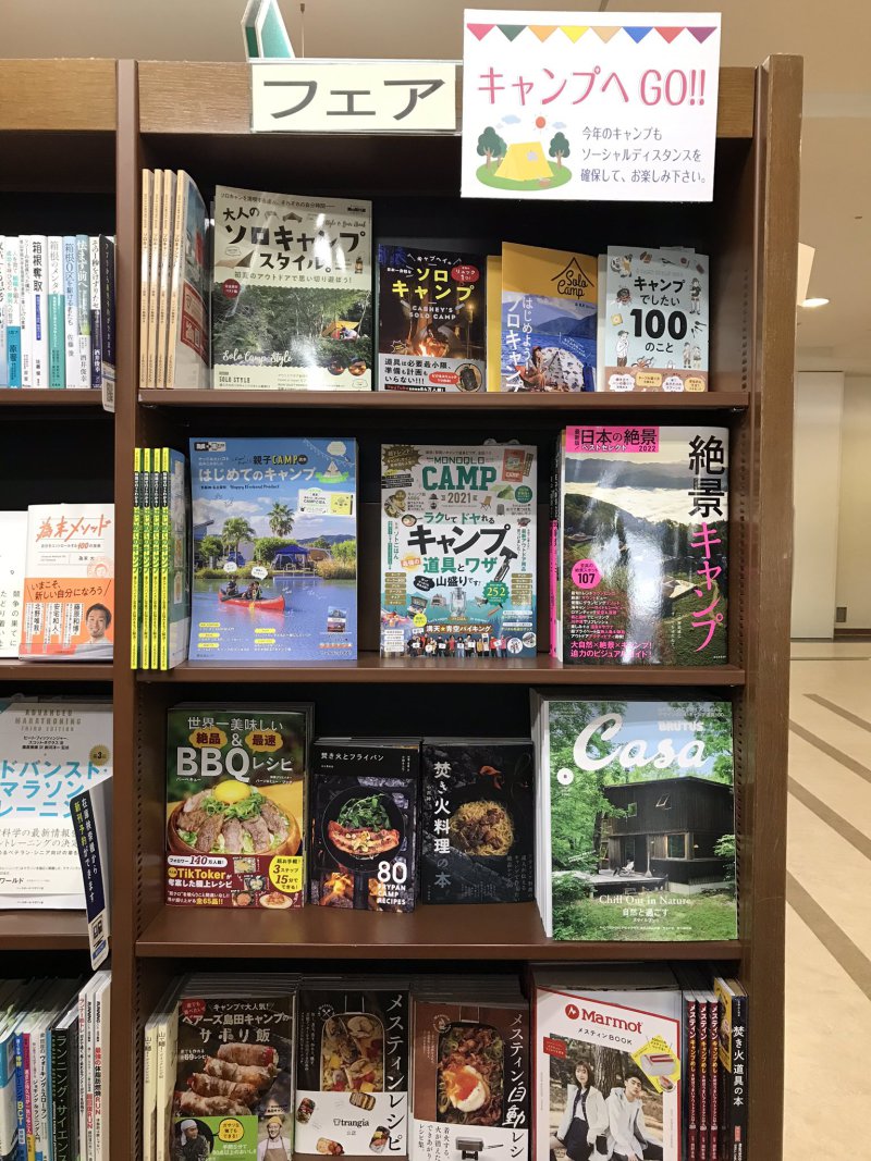 実用にて、キャンプに関する書籍をまとめて展開中です。家族で、一人で、外で、おうちで……さまざまな形でキャンプを楽しむための本が揃っております。メスティンなどの道具をつかったレシピブックや実際の道具が付録についたムックもありますので、気軽におうちでキャンプごはんを楽しむのにもおすすめです。実用3番のフェア棚にて。
