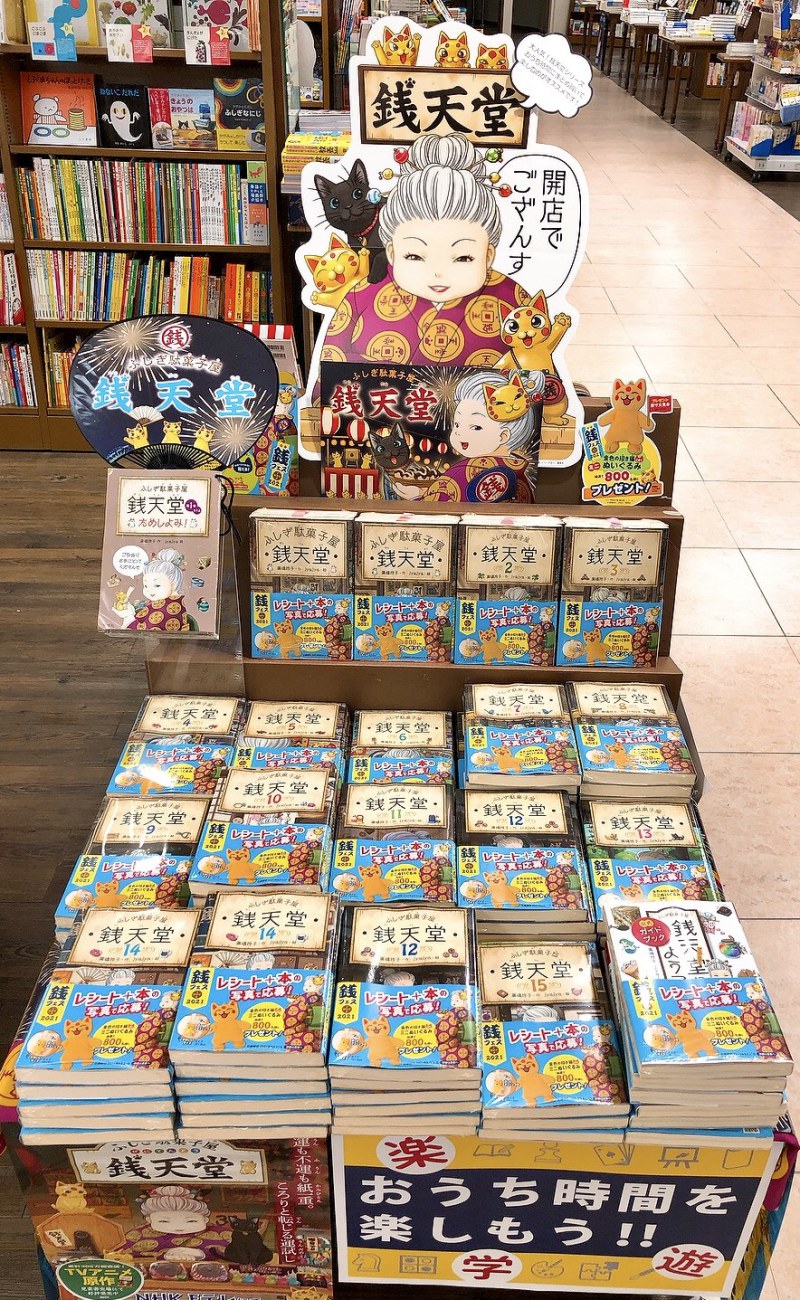 大人気シリーズ「ふしぎ駄菓子屋・銭天堂」のフェア「銭フェス2021」を展開中です!水色のキャンペーン帯がついた商品を購入、帯がついた書籍とレシートを写真に撮影して特設サイトにアップロードして応募すると、抽選で800名様に「金色の招き猫(こはく)ミニぬいぐるみ」が当たるプレゼントキャンペーンです。詳しくは、銭フェス2021特設サイトをご確認くださいね!