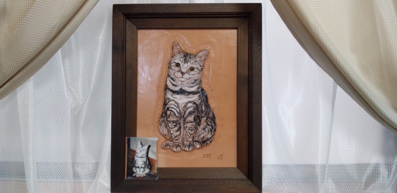【カービンテク】革工芸歴53年の革彫刻作家が独自開発の「立体肖像」技法を駆使して、牛革へ手彫りして、毛の一本一本まで、丁寧に仕上げる作品。ネームもサービスでお入れします。お届けは2~3か月後になります。