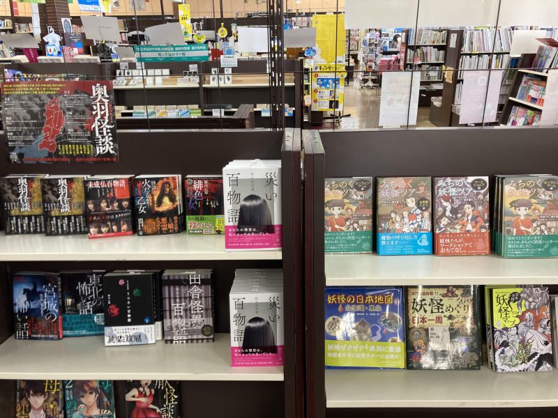 夏を涼しくする怖い本のフェアを展開中!今夏、注目の新刊は、山形在住作家の黒木あるじさんはじめ、東北ゆかりの作家さん達による怪談実話集『奥羽怪談』(竹書房)、お隣宮城県在住の郷内心瞳さんの新刊『災い百物語 拝み屋奇譚』(アプレミディ)、『怪談 火だるま乙女』(竹書房)、『拝み屋念珠怪談 緋色の女』(KADOKAWA)などなど。同じく東北ネタで、東北の妖怪たちが登場する児童向け読み物『みちのく妖怪ツアー』シリーズ(新日本出版社)の新刊「オンラインゲーム編」も発売されています。