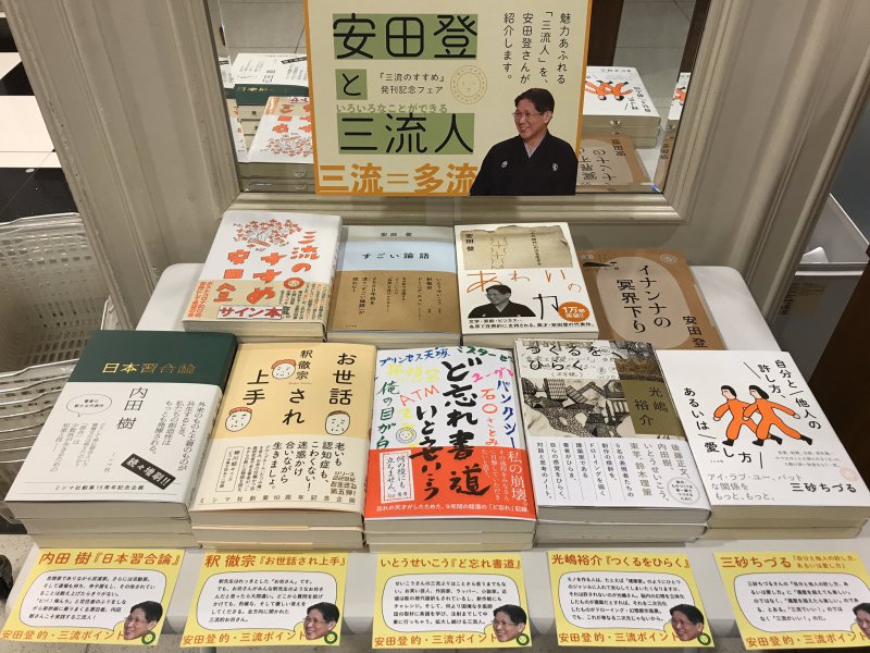 ただいま3階カウンター横にて、安田登さん『三流のすすめ』(ミシマ社)発刊記念フェアを開催中です。三流=多流!魅力あふれる「三流人」を、安田登さんがご紹介。関連著書も一緒に展開しています。今なら『三流のすすめ』のサイン本もございますので、ご来店お待ちしております。