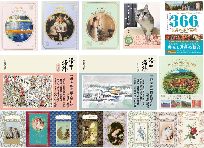 中でも担当者のおすすめは、パイインターナショナルから刊行されている「366日絵画」シリーズです。現在までに『366日風景画をめぐる旅』『366日物語のある絵画』『366日絵のなかの部屋をめぐる旅』の3種が発行されていて、1日1点、366点の絵画が楽しめます。モネ、ルノワール、ゴッホ、クリムト、フェルメール、マティス、ハマスホイなどの巨匠はもちろん、北欧やアメリカ、ロシアなどの知られざる名作がたっぷりと収録されているほか、ギリシア神話、聖書、中世伝説、おとぎ話、騎士物語などの絵画がぎっしりと掲載されていて、とてもお得なシリーズとなっています。