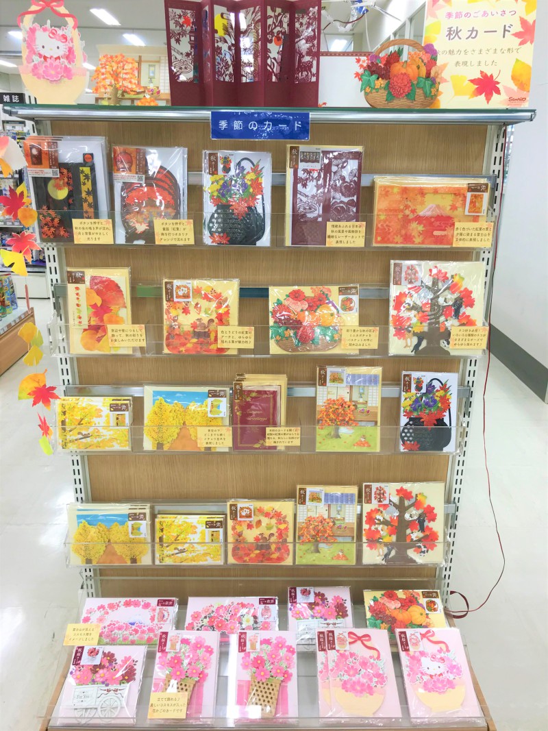 秋のグリーティングカードとレターのご紹介です。文具売場レター・カードコーナーにて、秋をモチーフにしたカードとレターをご用意しました。秋の虫の音がなるカードや繊細なレザーカットでお部屋に飾れるカード、窓辺や壁につるして飾れるカードもございます。また、秋でもピンク色がかわいいコスモスのカードもございます。ぜひ、ご覧くださいませ。