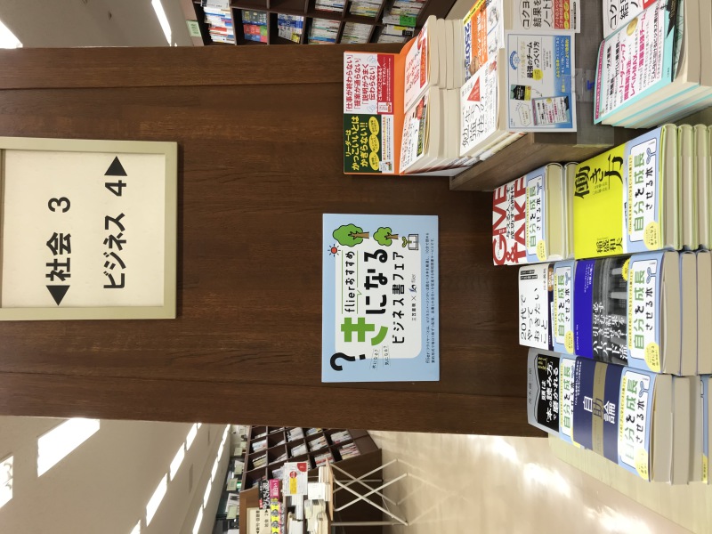 レジ側の入り口を入ってレジの正面、列「社会3・ビジネス4」の平台にて展開しています。