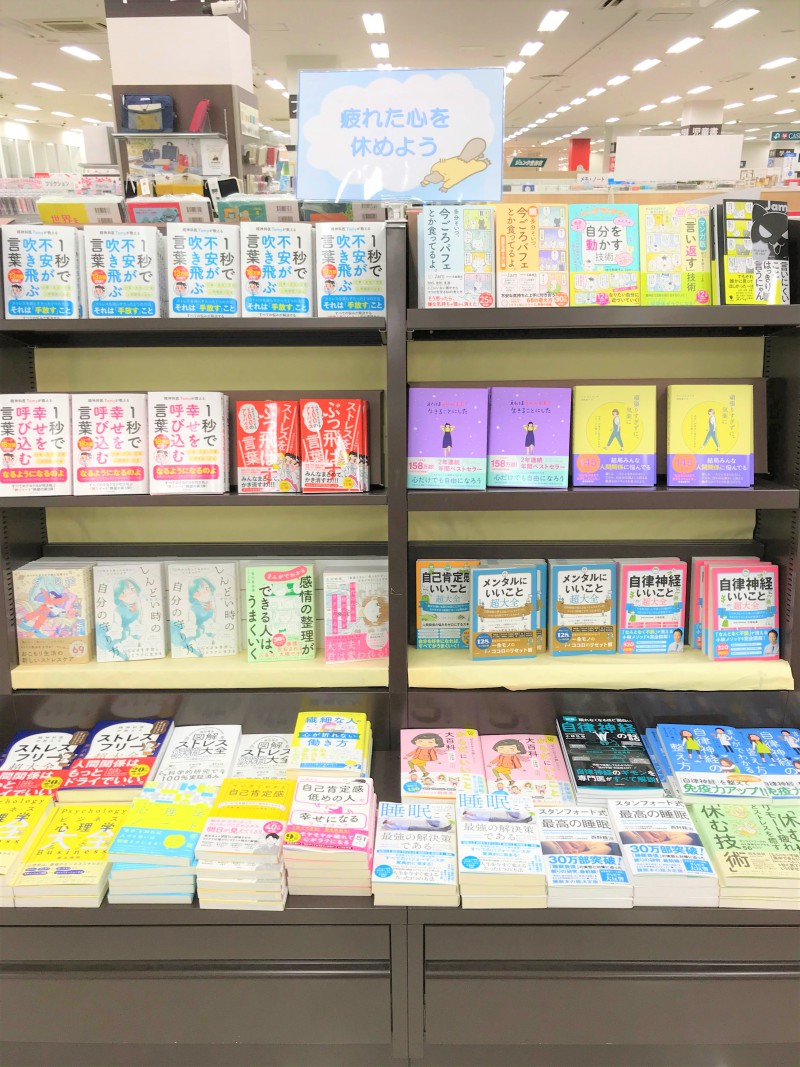 「疲れた心を休めようフェア」のご紹介です。コロナ疲れや夏の暑さでバテた体と疲れた心を休めませんか?学校や仕事での日々の疲れやストレスを少しでも軽くしよう!自律神経の乱れや睡眠不足でお悩みの方必見!本を読んで解決できるかも!?レジ前フェアコーナーにて展開中!ぜひご覧ください。