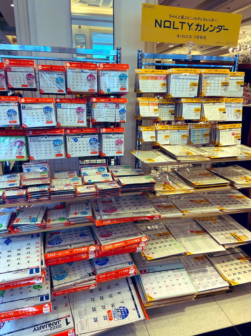 2022年度カレンダーが入荷致しました。1階壁面にズラッと並んでおります。壁掛けタイプや、卓上タイプ、風景写真のカレンダーやキャラクター商品等様々な種類を取りそろえております。今後も順次入荷がございますので、お気に入りのカレンダーをぜひ見つけに来てください。