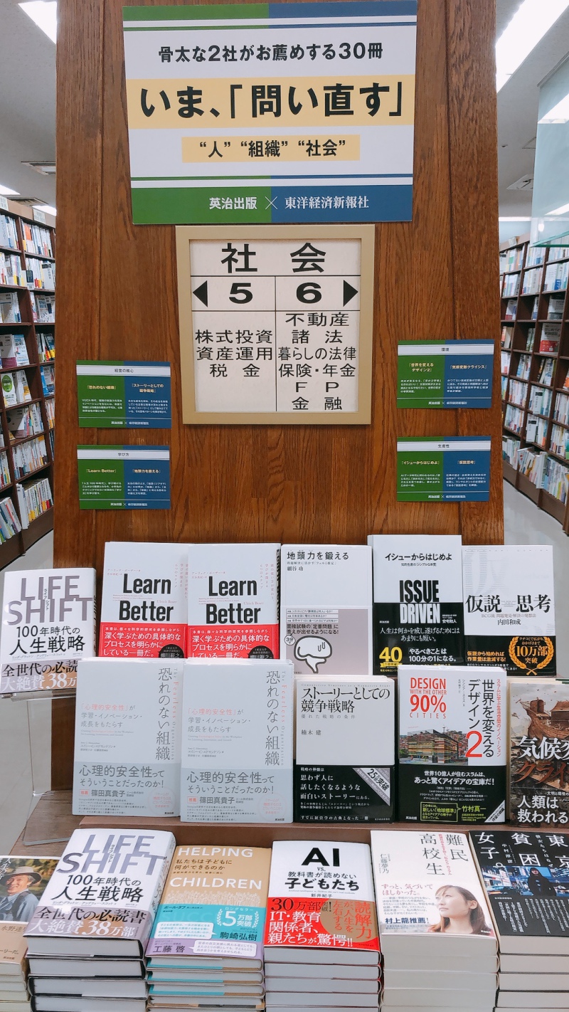 東洋経済新報社と英治出版。信頼のおける経営書を出し続けている両社が、タッグを組みました。先の見えないコロナ禍の中で、人や組織、社会の価値観も徐々に変わり始めています。変化の激しい時代だからこそ、立ち止まって考え、見つめ直す時間が必要なのではないか──。そのような想いから、「人」「組織」「社会」の3つのカテゴリーで、いま問い直すべきだと思われる15のテーマを設定し、合計30冊の本を両社が厳選しています。テーマは以下の通り。【人】 「人生」「学び方」「成功」「生産性」「共感」【組織】 「コラボレーション」「未来の組織」「経営の核心」「事業の在り方」【社会】 「資本主義」「テクノロジー」「教育」「地方の未来」「環境」「貧困」。いまの時期だからこそ「問い直す」価値がある本ばかり。ぜひ店頭でその中身をご確認ください。社会エンドフェア台にて開催中です。※期間中の入れ替え予定ございます。