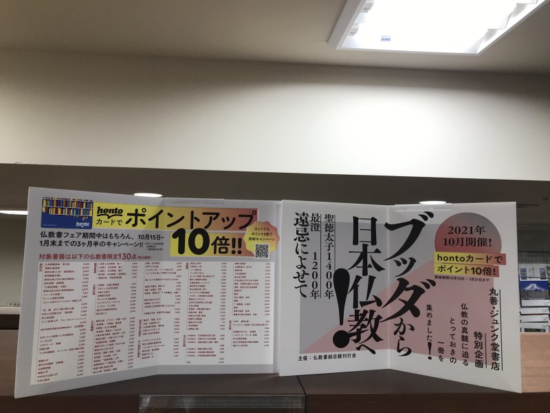 今年は聖徳太子の1400年遠忌、最澄の1200年大遠忌に当たります。そこで今回の仏教書フェアは「ブッダから日本仏教へ」と題し、ブッダから聖徳太子、最澄、空海、親鸞などを中心に入門書から経典まで仏教の真髄に迫る、仏教書総目録刊行会会員各社の極めつけの1冊を集めました。対象書籍をお買い上げのお客様にはhontoポイントが10倍になるキャンペーンも開催中です。5階新刊話題書裏側フェアコーナーでの展開は11月15日までにはなりますが、対象書籍への10倍ポイントキャンペーンは1月31日まで続きます。無料でお持ち帰りいただける「仏教書総目録」や「仏教のすすめ」などもご用意しております。是非お立ち寄り下さい。