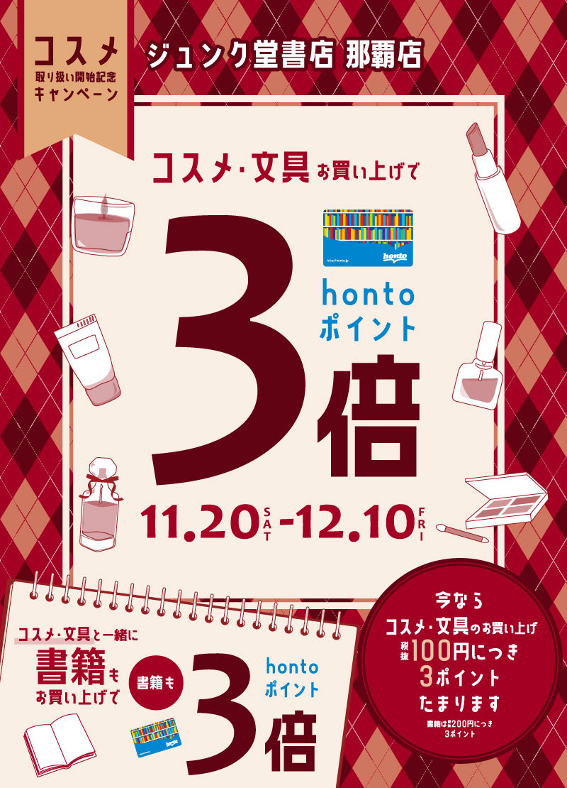 コスメ・文具お買い上げでhontoポイント3倍:コスメ取扱い開始記念キャンペーン(那覇店)
