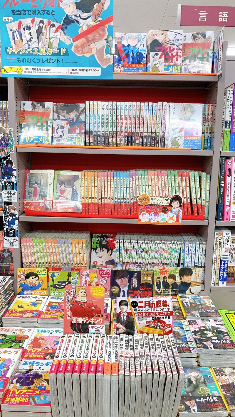 10月に入り、新しいアニメ・ドラマがスタートしました。鬼滅の刃ももちろん注目ですが、その他にも『王様ランキング』『ブルーピリオド』『二月の勝者』などコミック原作の話題作が目白押し!ブルーピリオドにはキャンバス風カード、二月の勝者には合格応援えんぴつをプレゼントしております。アニメやドラマを見て気になった作品がありましたら、紙のコミックもよろしくお願いします!