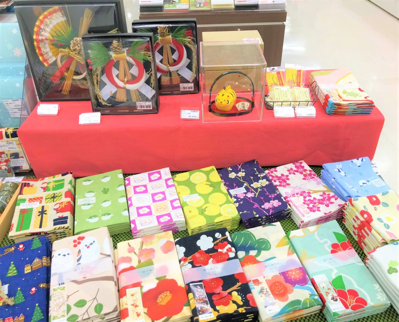 お正月準備応援「お正月かざりと季節の手ぬぐい」フェアのご案内です。文具売場入口にて、お正月飾りと季節の柄の手ぬぐいをご用意しております。年末の大掃除が終わったら、お部屋を彩る季節の柄の手ぬぐいをかざりませんか?華やかでおめでたい柄が揃っています。お正月の前にクリスマス柄もありますので、ぜひ、ご覧くださいませ。