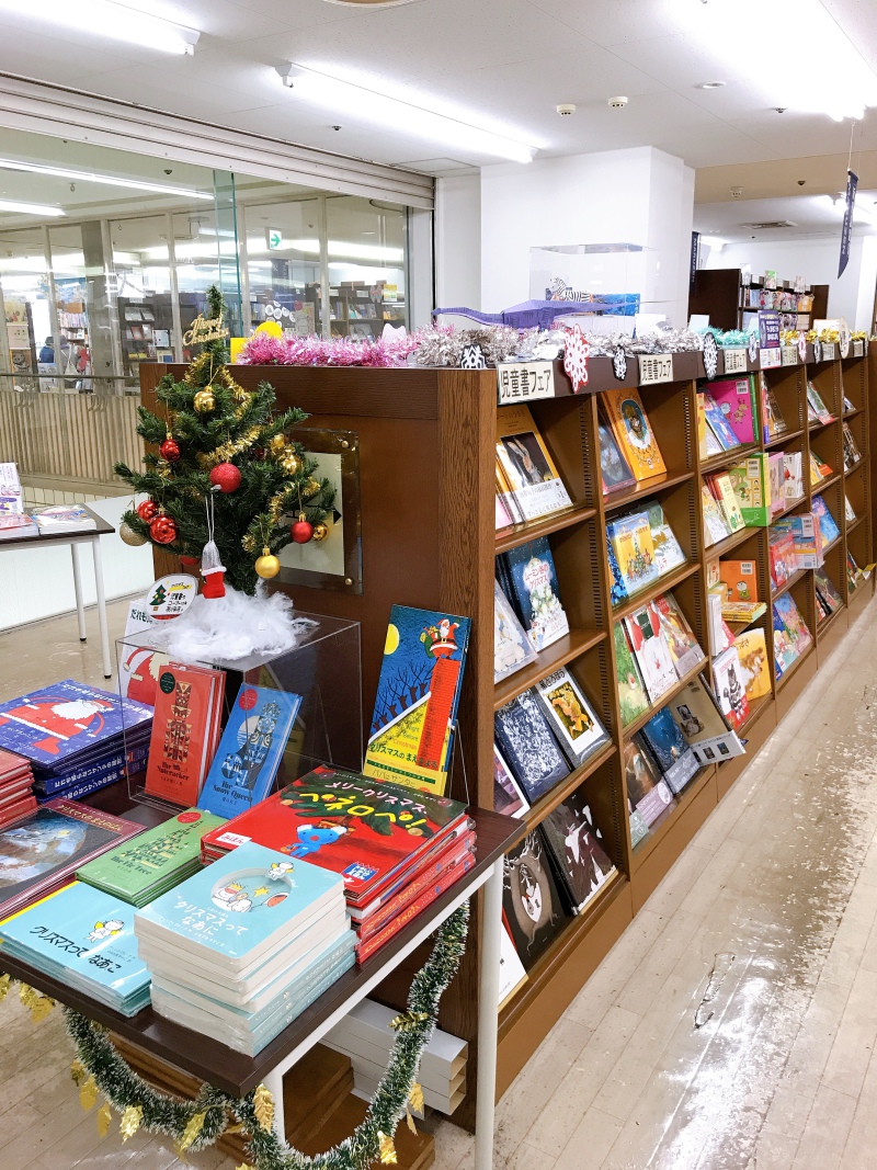 2階児童書売り場にてクリスマスフェアを開催しております。絵本だけでなく一部の作品はぬいぐるみや靴下、文房具といった絵本グッズも取り揃えておりますので、セットでプレゼントにされるのも良いのではないでしょうか。
