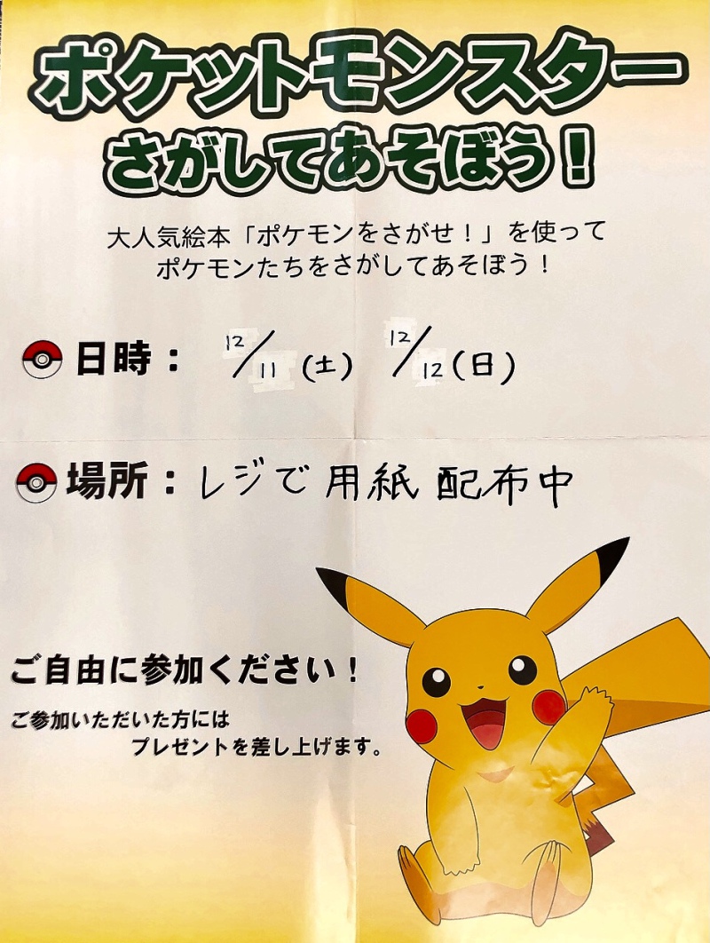 12月11日(土)と12日(日)の2日間、人気のさがしっこ絵本シリーズ「ポケモンをさがせ!」にちなんだ問題用紙をレジにて配布いたします。用紙の中に隠れているポケモンをさがして、プレゼントをゲットしよう!